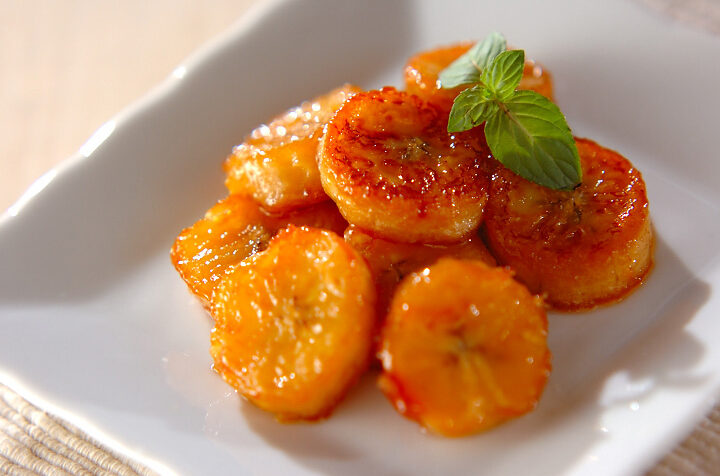 - バナナの追加: キャラメルソースができたら、その中にスライスしたバナナを加え、中火で軽く炒めます。約1〜2分間炒めることで、甘さと香ばしさが引き立ちます。